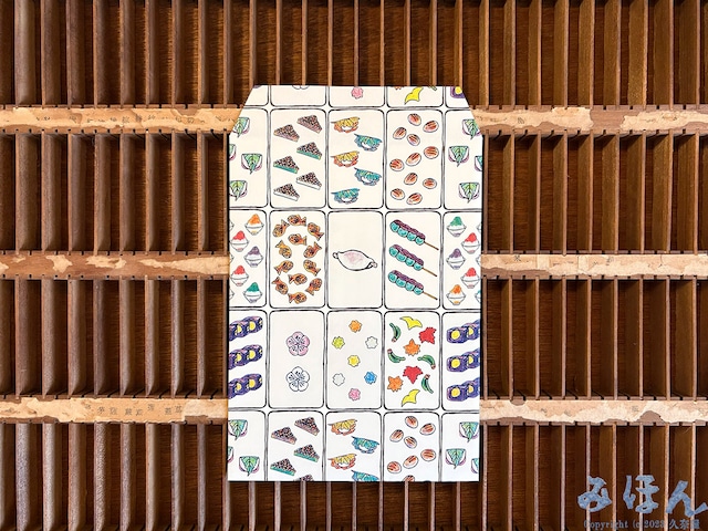 OK-006 贈り袋 大 お菓子暦 内容:贈り袋3枚 サイズ:118×160mm お土産や絵葉書を贈るときなど 贈り袋に包んでは如何でしょう しっとりとした質感の紙に とらんぷ繪を並べたような絵柄をのせて 一枚一枚丁寧に仕立てました 一月から十二月まで月の数だけ 四季折々のお菓子を描いたお菓子暦 表と裏それぞれ隣り合う十二箇月の 絵柄の組み合わせをお愉しみください 一月 葩餅 二月 梅最中 三月 草団子 四月 桜餅 五月 柏餅 六月 水無月 七月 金平糖 八月 夏氷 九月 栗羊羹 十月 干琥珀 十一月 亥の子餅 十二月 鯛焼き